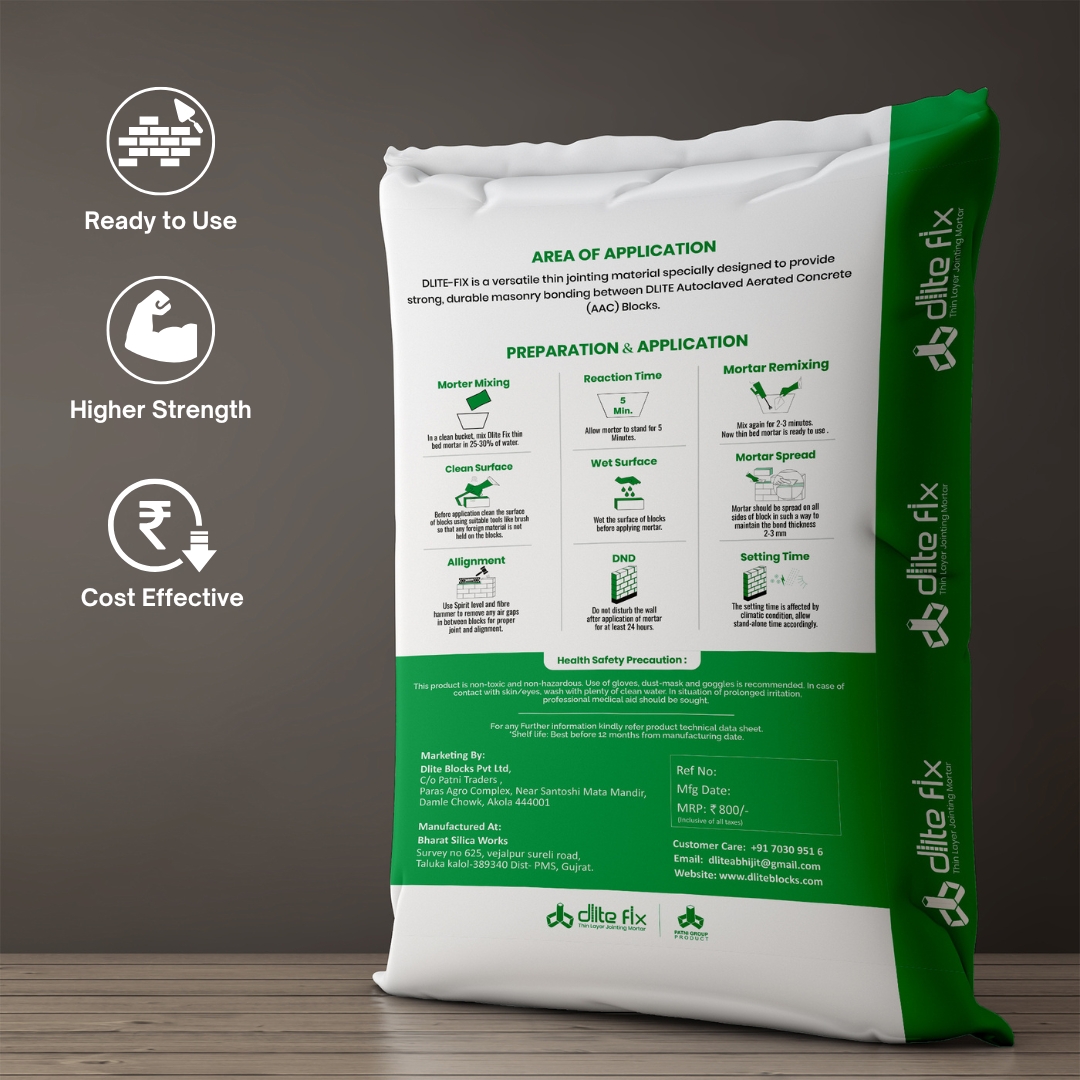 Dlite AAC Fly Ash Blocks Jointing Mortar is a ready-to-use, high-performance thin-bed adhesive specially formulated for joining AAC blocks, fly ash bricks, and other lightweight concrete blocks. Unlike conventional cement-sand mortar, this jointing mortar provides a stronger bond with thinner joints (2–3mm), reducing material consumption while ensuring superior strength and durability.